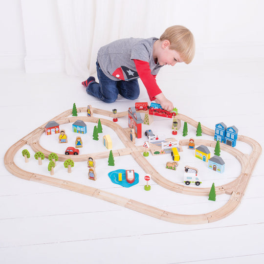 Consists of 87 play pieces. Most other major wooden railway brands are compatible with Bigjigs Rail.